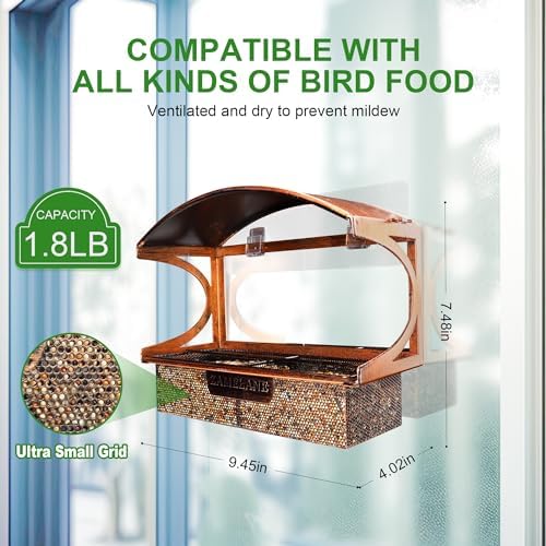Large capacity and Easy to clean: the hanging bird feeder can easily take out the tray to add bird food, and the window mounted bird feeder has a large capacity that can hold 1.8 pounds of bird food; the tray is mesh-shaped, with ultra-small holes, and has good hydrophobicity, keeping the bird food ventilated and dry , mold-free; If the tray needs to be cleaned, simply rinse the bird feed container.