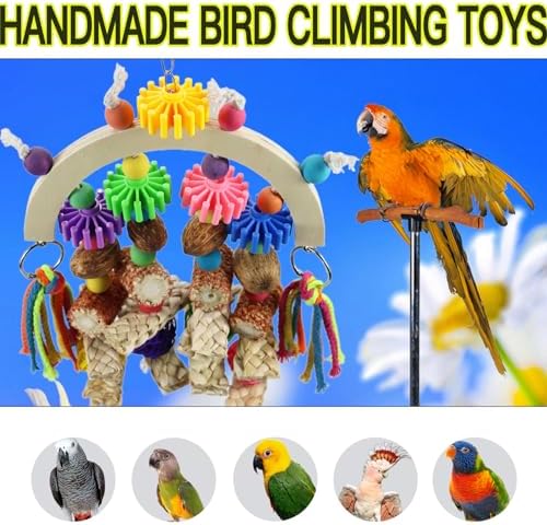 This is an all-natural corncob, nut, vine ball and corn husk toy with colorful cotton rope toys hanging from the ends to accompany our parrot friends as they play, climb and chew every day!This toy is made from all safe materials, so please feel free to use it!There are also beautiful plastic gear toys in different colors for them to chew on!There are also colorful cotton ropes on both sides which can also be removed and hung separately!This chew toy will keep your parrot busy, active, less destructive and more entertaining. And it can be used as a beautiful birdcage pendant
