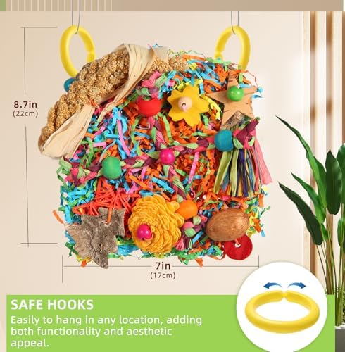 Hassle-Free Installation: Equipped with two secure hooks, the YIXUND Foraging Playground is easy to hang in any location, adding both functionality and aesthetic appeal to your bird’s habitat or making a thoughtful gift for bird-loving friends.