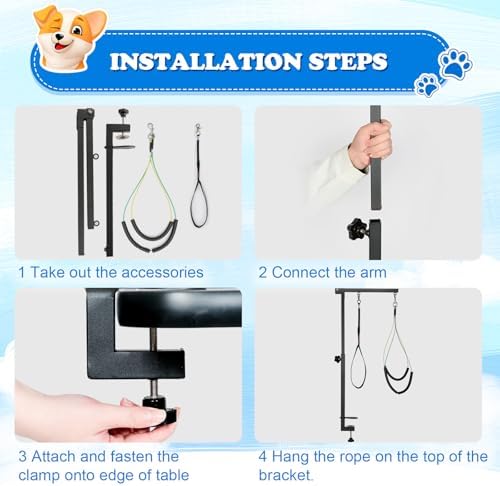 Multi-Scene Use for Pet Grooming: This dog grooming table arm with clamp includes the arm, clamp, and 2 loops (table not included). This dog grooming arm for small dogs is perfect for bathing, drying, hair cutting, and nail trimming at home. The high-quality metal grooming arm is ideal for both professional and amateur pet groomers.