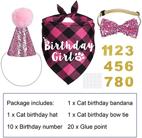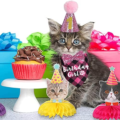 JOTFA Cat Birthday Party Supplies, Cat Birthday Outfits Cat Kitten Birthday Girl Bandanas with Cat Birthday Hat Crown Cat Bow Tie Birthday Number for Cat Kitten Birthday Decorations The cat birthday party supplies set would help you to dress up your beloved cat beautifully, let your cat have an unforgettable birthday party.