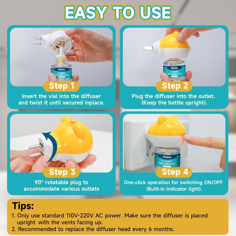 Safe Ingredients: The Woyamay cat calming diffuser is odorless, non-toxic, and drug-free, making it safe for both cats and humans. Mimicking the comforting pheromones produced by mother cats, the calming diffusers for cats creates an atmosphere where cats feel safe and calm, relaxing and eliminating feelings of tension and aggression.