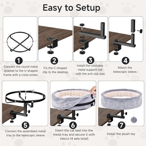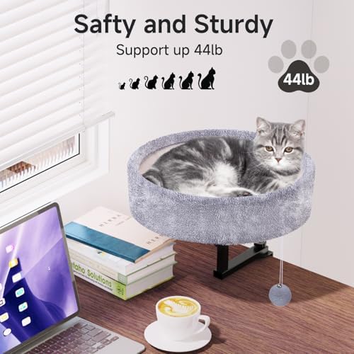 Sturdy & Durable Support:Constructed from robust metal, this cat bed supports up to 44 pounds, ensuring stability even when your cat jumps in. The round cat bed has a diameter of 15.28 inches and a height of 2.34 inches. It is made from soft plush fabric, providing maximum comfort for cats of all ages and breeds.Note: Desktop thickness need exceed 0.47 inches
