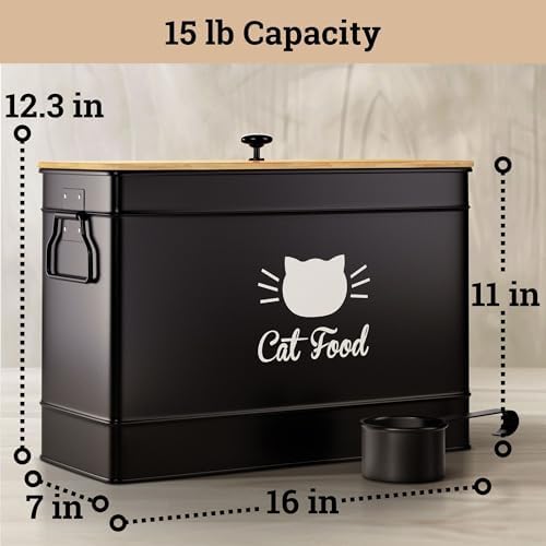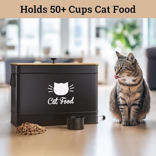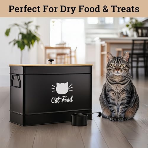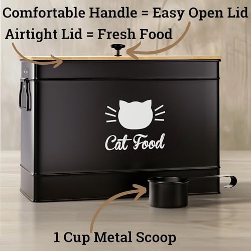 DECORATIVE & FUNCTIONAL – Designed for display with a sleek matte black powder coated finish and stylish bamboo lid, this cute cat food storage container matches any décor. Made of iron, this metal cat food storage container is light and not breakable, but sturdy and designed to last, as well as being easy to hand wash.