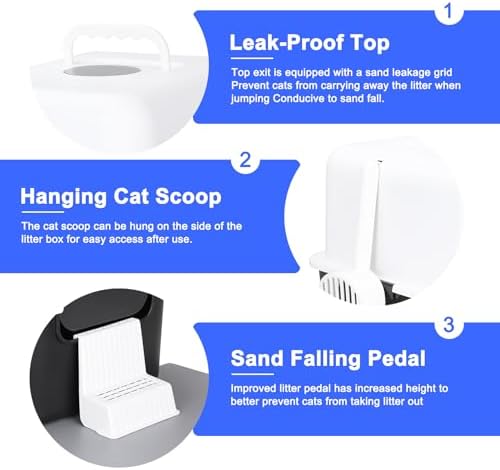 UNIQUE DESIGN: Cats can enter and exit through the front access opening, and a tightly leaking sand pedal is designed at the entrance and exit to prevent the litter from being carried out from the cat’s paws. Not only that, our product comes with a portable carrying handle on the top lid, which makes it easy for the owner to carry the litter box.Cats can rest by jumping on top of the litter box, which is also a good place to choose.