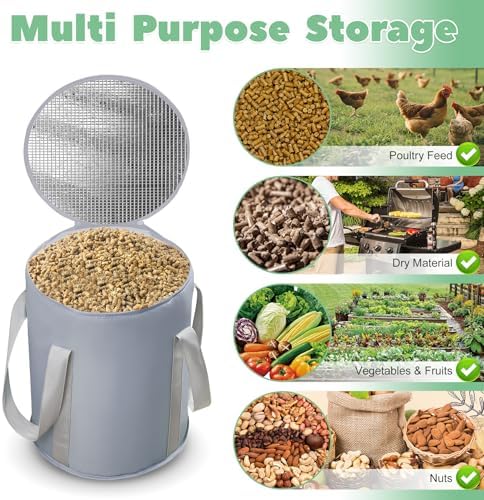 Easy to Use: No assembly required for this chicken food storage container.Foldable design and comes with a drawstring storage bag for easy storage when not in use.