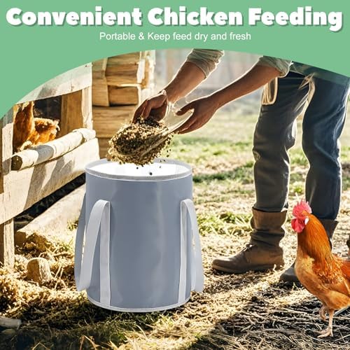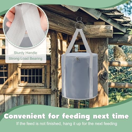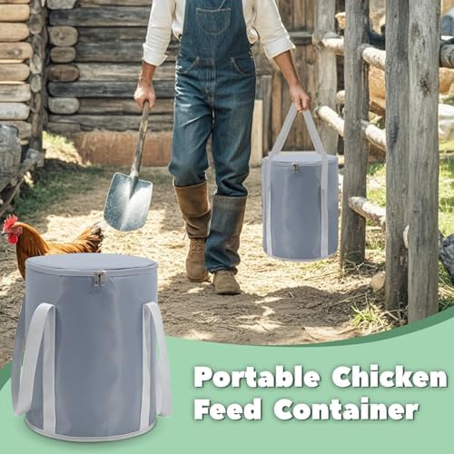 Portable Chicken Feed Container: The chicken feed storage container with portable carrying handle can be carried conveniently to the chicken coop for feeding and is easy to move when filling poultry feeders.If the feed is not finished, hang it up with the carrying handle for the next feeding.