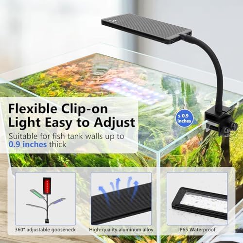 Newly Upgraded Gooseneck Clip On Aquarium Light: Features a 7 inch flexible gooseneck that can be adjusted 360° for height and direction, meeting all your needs. The clip is made of aluminum alloy with a tightening screw. It’s suitable for framed or frameless fish tanks up to 0.9 inches thick