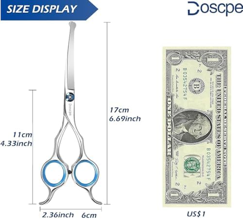 😸 [Safe to Use]: This professional Doscpe curved dog shears for grooming is designed with blunt round tips end, so don’t worry about hurt your dear dog in accident, especially when grooming the sensitive areas like the eyes, ear, face, nose and paws.