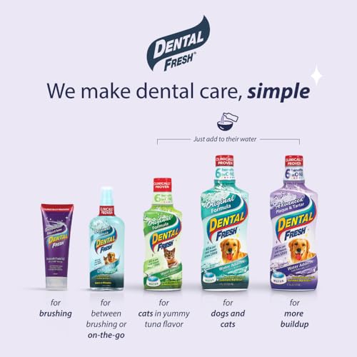 HOW TO FIX STINKY DOG BREATH: Taking care of your cat or dog’s oral health has never been easier. Dental Fresh Advanced Plaque and Tartar is truly the world’s first toothbrush in a bottle. Adding it to your pet’s water is like brushing their teeth every time they drink – without the struggles that most pet parents face when trying to use a dog toothbrush and toothpaste on an unwilling pet. Dental Fresh dog breath freshener water additive is beneficial to clean your pet’s teeth and freshen their breath all while helping to reveal your pet’s naturally white smile. This teeth cleaner for dogs helps promote healthy teeth and gums in pets that may have never had a daily oral routine. When dogs and cats develop dental disease, it can lead to additional problems throughout their body. That is why it is so important to recognize the signs of dental issues in your pet – bad breath, yellow or brown teeth, swollen, red gums, weight loss, and poor appetite – and prioritize oral health. All of the pets in your household can drink from the same water bowl since Dental Fresh has been formulated for dogs and their feline friends. Unlike many dog breath treatments on the market, Dental Fresh contains no alcohol, no sugar, no surfactants or detergents, or artificial flavorings. We know that your dogs and cats are more than just pets – they are part of the family – so Dental Fresh formulates premium oral health products that pet parents can actually afford. Your pet will have fresher breath, whiter teeth, and healthier gums and you will feel confident knowing that you are being proactive with your pet’s oral health – making you both happy and able to focus on more important things like walks, games, and snuggles.