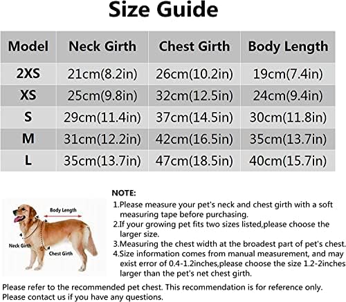 Measure the circumference at the broadest part of pet’s chest and neck.XXS: Chest: 26cm/10.2in; Neck:≦21cm/8.2in;XS: Chest: 32cm/12.5in; Neck:≦25cm/9.8in;S: Chest: 37cm/14.5in; Neck:≦29cm/11.4in;M: Chest: 42cm/16.5in; Neck:≦31cm/12.2in;L: Chest: 47cm/18.5in; Neck:≦35cm/13.7in;