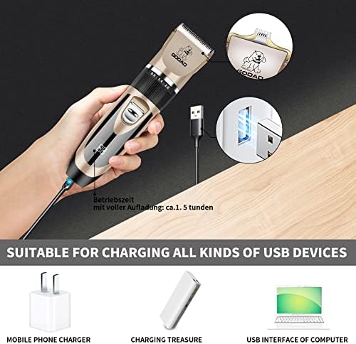 Long Lasting Battery & LED Indication: USB charging design .2200mA High Capacity Li-ion Battery, charging for 3 hours and can sustain use of 250 minutes.With LCD display,for reminding using and charging status,helping you better control the grooming work.Rechargeable design of this dog clipper, you don’t have to buy replace batteries. Long-term use does not cause wrist pressure or pain