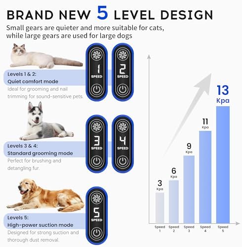 Quiet Operation with Adjustable Suction Levels: Our grooming vacuum is designed to keep pets calm, operating at a whisper-quiet level of just 45 dB on its lowest setting. With five suction levels and a powerful 13 kPa maximum, you can tailor the grooming process to your pet’s comfort.