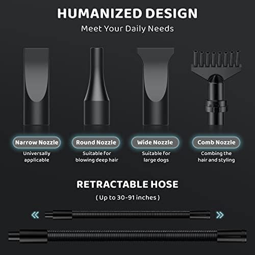 Multifunctional Use: This pet blow dryer is equipped with 4 different nozzles to meet different drying needs for different pets. For your various needs, the pet hair dryer can also be used to dry your car, floors, furniture, etc.