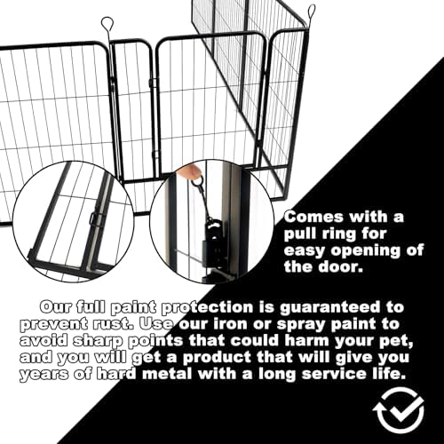 SAFETY FIRST! The dog playpen high quality 2.5mm thickened metal tubing, combined with precision welding process, strong enough to withstand the impact of active pets. Gravity-sensing latch prevents smart dogs from “escaping” and is easy to operate with one hand. Firmly welded wire seams on the inner mesh, small gaps between the wire mesh, no snagging for puppies and no obstacles for older dogs. Eliminate the risk of drilling out or getting stuck in the neck, give it freedom, but also give it foolproof protection! Let your dog have fun with peace of mind while you can relax and enjoy the outdoor time.