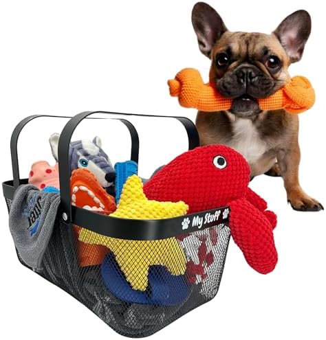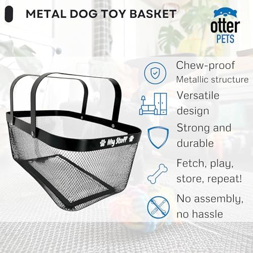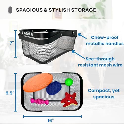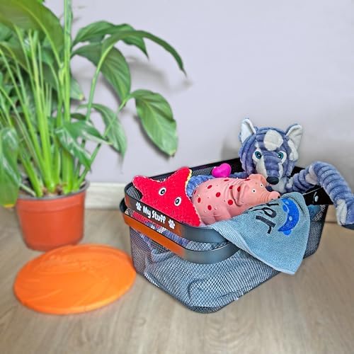 Ample Storage Capacity: 16 (L) x 10 (W) x 7 (H). Designed to efficiently store leashes and toys, this dog toy box for living room area offers generous space. The metal dog toys basket is ideal for keeping your home tidy, serving as a functional and stylish dog toy holder. It’s perfect for holding treats, collars, toys, blankets, towels, outfits, and much more.