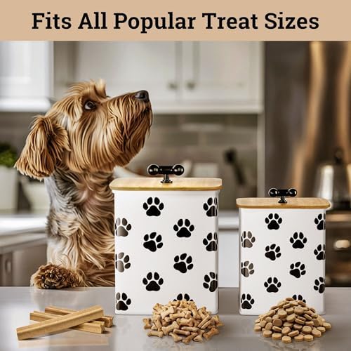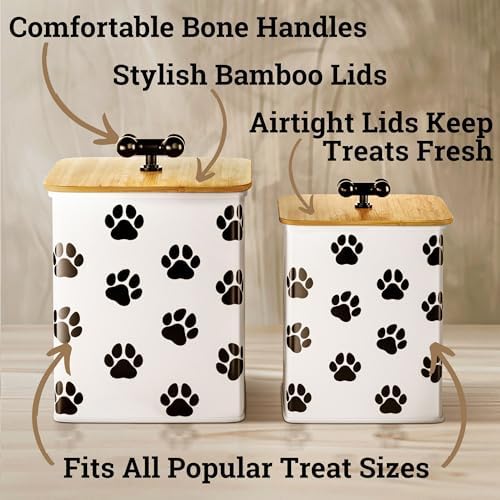 EASY OPEN LIDS MAKE TREATS ACCESSIBLE – With comfortable bone-shaped handles, these pet treat jars make dog treat storage practical and stylish. Treats are easy to access yet sealed and secure from your pet. No need to reach inside a cupboard – this kitchen pet jar set looks great on display.