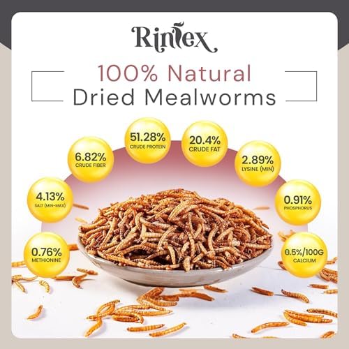 Rinlex dried mealworms, available in 8 oz to 10 lbs, are a high-protein treat for animals, essential for laying hens and roosters!