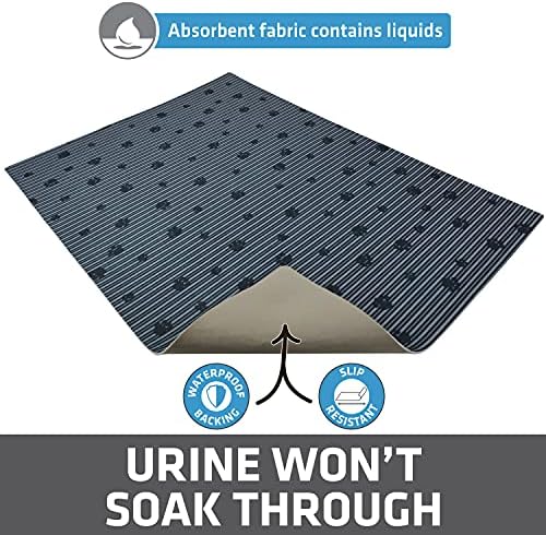 ABSORBENT POLYESTER FABRIC, WITH WATERPROOF BACKING (URINE-PROOF): Patented Drymate material absorbs and contains liquids and wicks away moisture. The waterproof backing stops liquids and urine from soaking through and prevents them from damaging or staining the surface below.