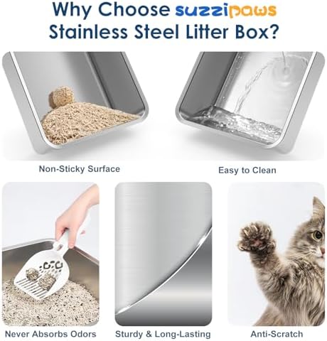 Doesn’t Absorb Odor: Cleaning the high walled stainless steel litter box for cats is very easy as waste slides off the smooth and nonstick surface effortlessly, leaving no lingering odors behind. Sturdy stainless steel won’t get rusts and scratches where odor can harbor like the plastic litter box does, creating a clean and hygienic environment for your cats