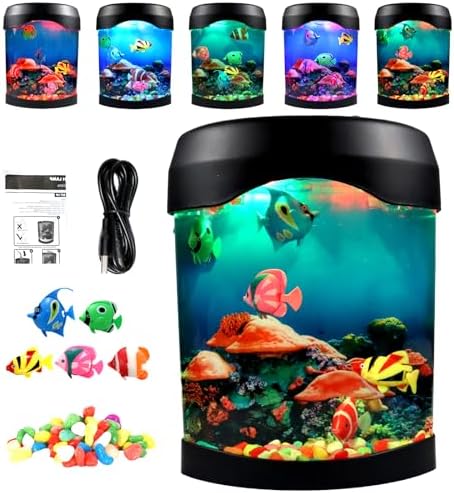 【Versatile Fish Aquarium Mood Night Light】:This desktop tank holds 5 large color Fake Fish ,Real looking fish,(They’re pink, green, blue fish. Give you a 7 colored light aquarium world) It is suitable for Home décor, Office Table Lamp, Bedroom Night Light and Party Decoration. It is ideal for any room and all age group. You can also mix and match other marine animals to better artificial decorative effect, just like a mini aquarium