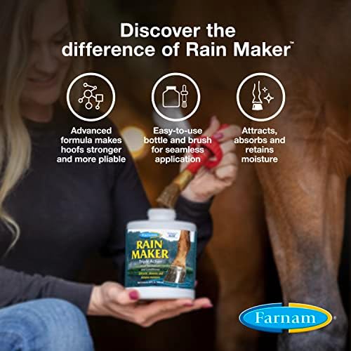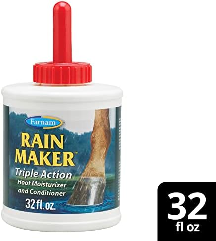 Dry weather, dusty stables, lack of exercise. These factors combine to rob a horse’s hoofs of moisture, leaving them hard and brittle; susceptible to cracks, injury and disease; unable to regenerate quickly because of slowed growth. Rain Maker Hoof Moisturizer and Conditioner can protect your horse’s hoofs from these damaging conditions. Like a rainy day, Rain Maker Hoof Moisturizer and Conditioner leaves hoofs with a healthy balance of moisture. It’s an advanced hoof dressing that helps restore and condition damaged hoofs, so they can absorb the stresses and shocks of daily life with ease. The triple action formula of Rain Maker Hoof Moisturizer and Conditioner leaves your horse with hoofs that attract, absorb and retain moisture. Helps prevent painful problems like cracks, splits and contracted heels. Enhances color, sheen and texture, leaves hoofs with a natural glossy, lustrous appearance. Widely recognized as the leader in quality horse care products, Farnam offers an ever-expanding range of equine essentials and has been your partner in horse care for over 75 years.