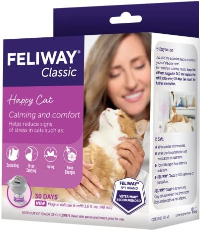 Is your cat peeing outside the litter box, scratching your furniture, or hiding on a regular basis? These behaviors may be caused by fear and anxiety. FELIWAY products are vet recommended, drug free, and shown to help alleviate many of these unwanted cat behaviors. FELIWAY CLASSIC provides “happy messages” by mimicking the natural feline reassuring messages (pheromones) to make cats feel calm and comfortable at home. This product has been found to reduce scratching, spraying, and hiding for 90% of cats – many owners see results within 7 days. Cats can be sensitive to change, so if you anticipate changes in the home (moving, renovation, new pets, etc.), FELIWAY is effective in helping your cats remain calm, and adapt to the changes without unwanted behaviors. This FELIWAY Classic Diffuser Refill kit includes three refill vials (diffuser sold separately). Plug your diffuser in the room(s) where your cat spends most time – each diffuser covers up to 700 sq. feet. Make sure your diffuser isn’t covered by curtains or behind furniture. Each refill can last up to 30 days. For maximum effectiveness, you should replace diffuser every 6 months. Follow the instructions when plugging in diffuser, and plug it in upright.