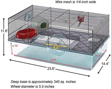 Large Living Space: Hamster cage measures 23.6 length x 14.4 width x 11.8 height inches, deep base measures 23.6L x 14.4W x 4.75H (approx. 340 square inch base), wire top mesh is 1/4 inch wide, exercise wheel is 5.5 inch diameter