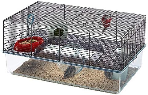 Exhausted from searching for a hamster cage that is large enough for your hamster? Then search no more, The two story Favola Hamster Cage by Ferplast is larger than most hamster cages on the market today and is a modular design so you can connect onto other habitats or play areas. This hamster cage is fully equipped with everything you need to get started including a hamster wheel, food dish, water bottle & hamster hide away. The large extra deep 4.75 inch base eliminates bedding from scattering around the cage and caters to your hamster’s instinctual desire to burrow by providing approx. 340 sq. inches of space. The entire hamster cage measures 23.6L x 14.4W x 11.8H inches & the 5.5 inch exercise wheel is conveniently placed between the two floors (exercise wheel can easily be removed in order to upgrade to a larger wheel). The ladder & top floor are solid plastic and safe for hamsters. The top wire portion of the cage features a durable black coat which is rust resistant and the safe 1/4 inch horizontal bar space to keep the smallest hamster breeds inside the cage. The entire hamster cage comes with a 1 year manufacturer’s warranty on all parts.