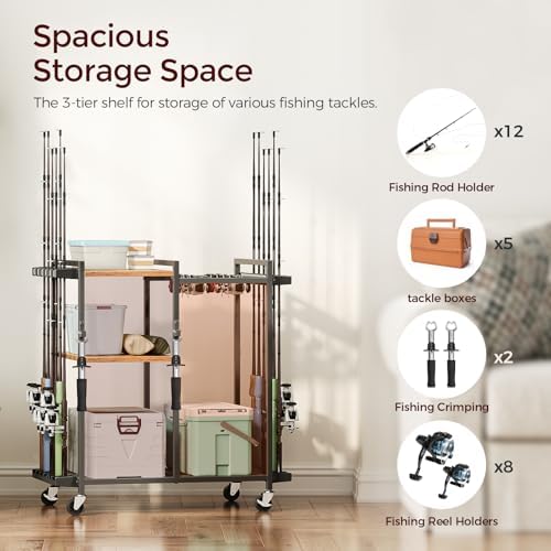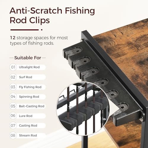 Versatile Fishing Tackle Rack: The 3-tier fishing pole rack can hold a wide range of fishing gear, including tackle boxes, fishing nets, bait devices, and more. Two rows of wavy brackets offer secure placement for all kinds of fishing reels, ensuring easy accessibility