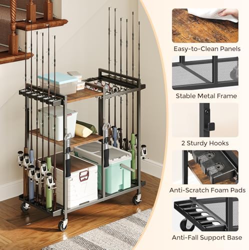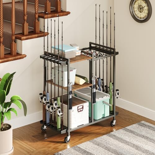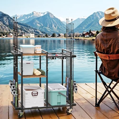 Effortless Movement in Multiple Settings: This fishing rod tackle cart includes 4 casters for smooth 360° movement and 2 with brakes for secure fixation when not in use. The fishing gear organizer can be conveniently moved to the garage, basement, or outdoors