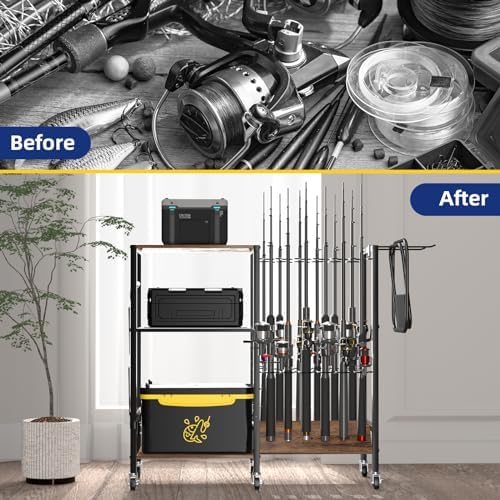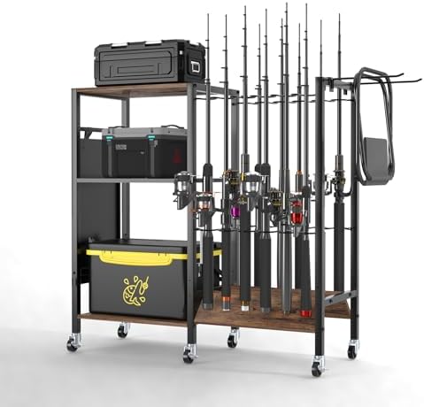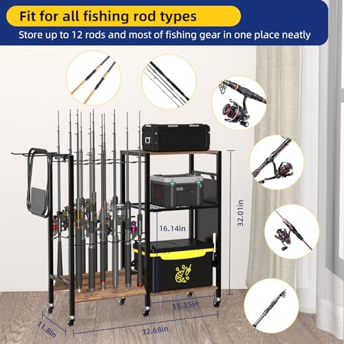 STABLE FISHING GEAR TACKLE CART: As a Mountable Fishing Equipment Organizers for Garage, not only it can store all your fishing rods, but also can store fishing accessories, like folding chair, Fishing Bucket ect. And you don’t need to worry about the bearing, because this two shelves can each hold up to 100 pounds of weight.