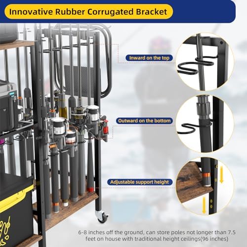 INNOVATIVE DESIGN: Our fishing rod rack adopts an innovative structure. With a high-density fiberboard(MDF) at the bottom to prevent it from sliding down, and two ripple bracket in middel and top to prevent swaying right and left, it can hold the fishing rods of different diameters firmly and securely. And also, the ripple brackets are with rubber covered which will provide the best protection for your expensive rods.