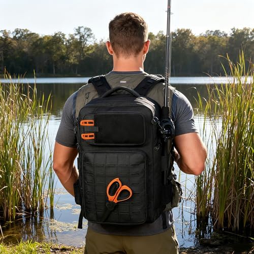 [PERFECT SIZE AND EXCELLENT STORAGE SPACE] This fishing backpack size: 18 inches x 13 inches x 11 inches, it can store your needed fishing gear (fish box, sunglasses, scissors, pliers, fishing tools), and the side also has a stowage and fixing rod function, which allows to reach your fishing gear at any time.