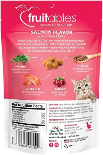 Treat your feline friend to the irresistible crunch and nutritious goodness of Fruitables Cat Crunchy Treats, a healthy and flavorful snack designed with your cat’s health and happiness in mind. Crafted with real salmon as the first ingredient and enhanced with antioxidant-rich cranberries, these protein-packed treats provide a delicious source of essential nutrients that support feline energy and well-being. Each bite-sized treat is low in calories, making it an ideal option for cats on a weight-conscious diet or as a zero-guilt daily reward. Made with no wheat, corn, soy, or artificial flavors, Fruitables cat treats are perfect for pets with food sensitivities or allergies, offering clean, wholesome ingredients that you can feel good about. The crunchy texture helps promote dental health by gently scrubbing away plaque and tartar as your cat chews. Whether you’re rewarding good behavior, bonding during playtime, or just treating your pet to something special, Fruitables Cat Crunchy Treats are the perfect combination of taste, texture, and nutrition. Ideal for cats of all breeds and life stages, these treats are proudly made in the USA and packaged in a resealable pouch to lock in freshness. Choose Fruitables Salmon with Cranberry flavor for a crunchy, protein-rich cat snack that’s bursting with real fruit and premium ingredients. Your cat will love the flavor—you’ll love the quality.
