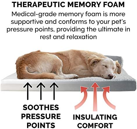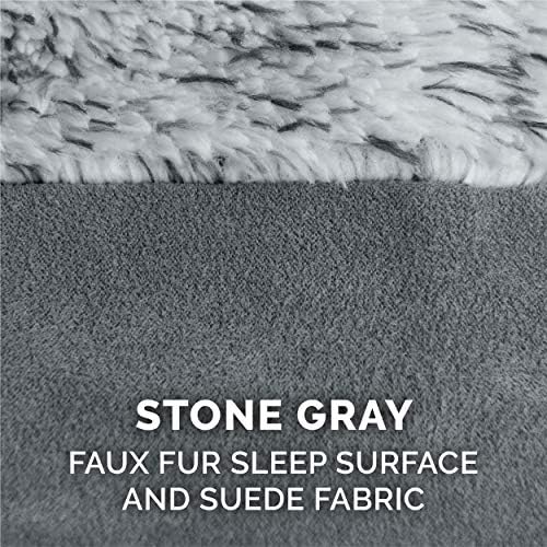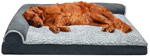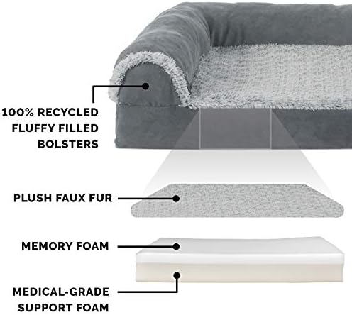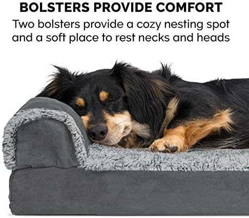 Pamper your pet with a Furhaven Two-Tone Faux Fur & Suede L Chaise Dog Bed! A luxuriously soft faux fur sleep surface is complemented by suedine covered bolsters and gusset. Ultra-plush, flecked faux fur provides a snuggly soft sleep surface and trims the edges of the bolster for a chic flair. The two-tone design hides dirt and pet dander better than traditional plush sleep surfaces. The L-shaped bolsters support your pet’s back and hips, providing additional support. The L-shape also provides the perfect nook for pets that like to nest into comfort. The two raised, rounded bolster ends allow your pet to lay their paws or neck on the pillowed edge, helping to align the neck and spine. Memory foam is designed to work with your pet’s weight and contour to their body providing better overall support and relief from painful muscles and joint discomfort. Available in various stylish colors and diverse sizing options so your pet can sprawl and lounge the day in maximum comfort and style. Easy to clean. Cover care: Remove from core before washing (see hang tag and/or seam label for care instructions). Foam care: Memory foam is highly absorbent. Spot clean with mild soap or enzyme-based cleaning spray. Rinse but DO NOT SOAK OR SUBMERGE. Press out moisture with a dry towel and air dry. A fan may be used to speed drying. Do not wring or place in machine dryer. Dry completely before use. Not for unsupervised use by animals with destructive chewing behavior.