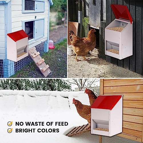 WALL MOUNTED: This hanging poultry feeder comes with a lid, keeping your feed dry and fresh, even during harsh weather conditions. There are two pre-drilled holes on the back panel, it can be wall-mounted with ease. This makes it an excellent chicken feeder for outside coops, where space is often limited.