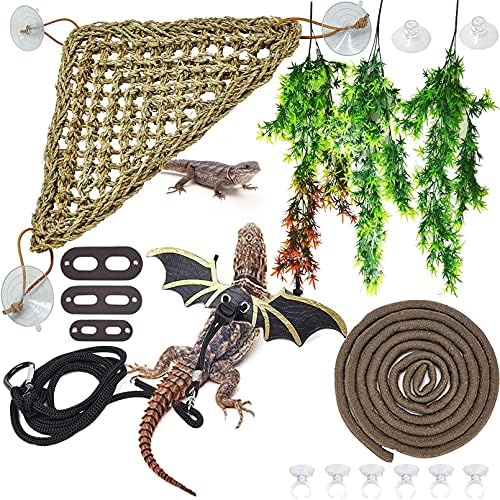 Our lizard hammock bed is made of 100% natural seagrass, All by hand woven, seagrass fiber material, soft but very sturdy and durable.Bearded dragon adjustable leash bat wings is made of soft leather and nylon rope,non-toxic and tasteless.Our reptile vines bend pretty easy and are perfect for small or medium sized reptiles or amphibians.Also, the jungle vines can help keep the humidity in longer, taking up a decent amount of space.Great for lizards,chameleons, tree frogs, geckos, tortoises, snakes and other reptiles or double the vine up to make a sturdier climb comes with suction cups to attach to the glass and support the vine.Add some easy to clean and NON-TOXIC artificial leaves all around to give the jungle atmosphere. An all you need set to keep your beardie happy!