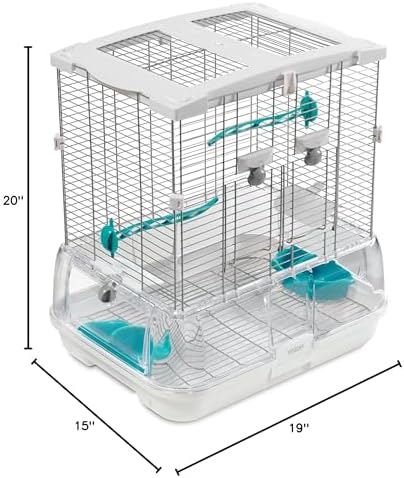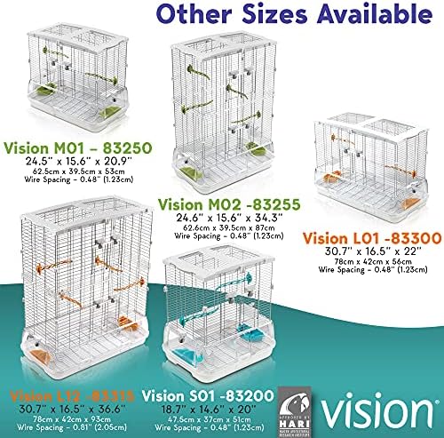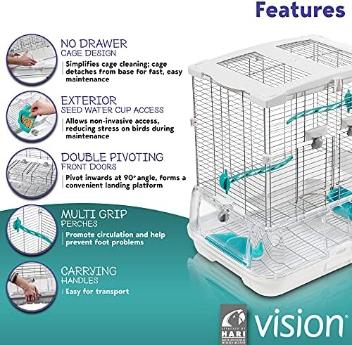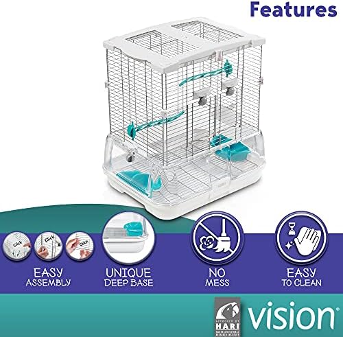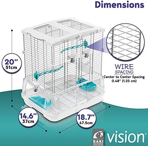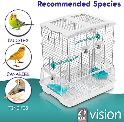 This Vision bird home has many revolutionary design features that set it apart from traditional bird cages. It provides your bird with lots of room to move around and bird movements cause air currents, which flow outwards, and in the case of most standard bird cages these air currents eject waste and seed debris outside of the cage and onto the floor. With Vision Cages, the combination of the debris guard, the deep base and the placement of the seed and water cups helps combat air currents to keep the majority of the waste and debris inside the cage. Most cages come with pull-out drawers that fail to do a good job of collecting bird waste and create maintenance headaches as a result. Vision’s unique no-drawer design simplifies cage cleaning-simply detach the cage portion and empty the contents of the base into the waste bin. The result is less time-consuming, messy cleanups associated with bird keeping, leaving you more time to enjoy your pet. Vision’s deep base can handle multiple types of litter, while raised ridges inside the base provide air circulation .The bird home also allows non-invasive, exterior access to seed/water cups, reducing stress to birds during maintenance. In addition, multi-grip perches promote circulation and help prevent foot problems. The knock-down cages are easy to assemble with a five-minute quick, click-snap assembly. Vision bird homes are available in a variety of sizes, including small bird cages or large wire cages. They are recommended for bird species as listed due to their natural behaviors and not by size of bird. The small cage is suitable for budgies, canaries and finches. Vision also creates a variety of bird cage accessories including parakeet perches, parakeet toys, parakeet mirrors, bird baths, bird nest holders, bird cage stands and other parakeet supplies.