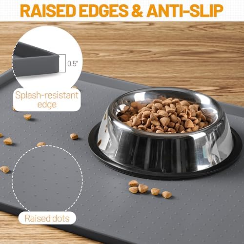 EXTRA-TALL LIP PREVENTS SPILLS: Super high outer lip (0.5” raised edge) keeps all the mess contained on the doggie placemat and away from your floor. Anti skid surface prevents dog bowls from moving. Use this cute waterproof mat under pet food bowls for dogs, water dishes, pet fountains, automatic feeders, feeding stations to protect your floors.