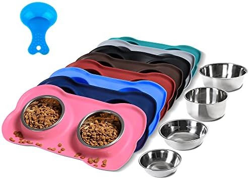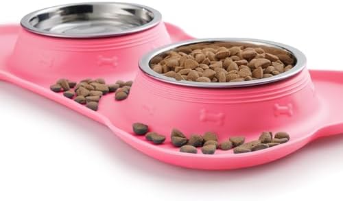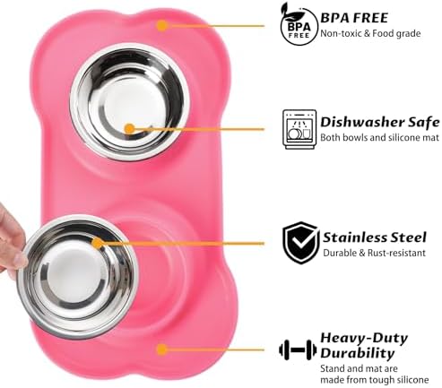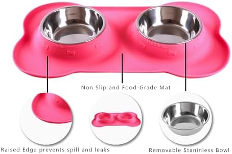 Safe Food Grade Material – Our dog bowls are made of food grade stainless steel and BPA Free silicone mat, This is a fantastic dog cat puppy food and water dish to prevent messy eating and drinking! Handy all in one feeder for messy pups, new puppy or Small Medium Large dogs.
