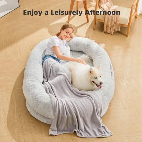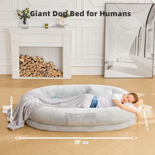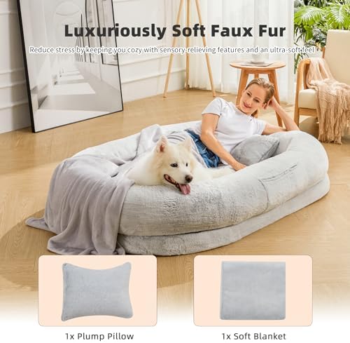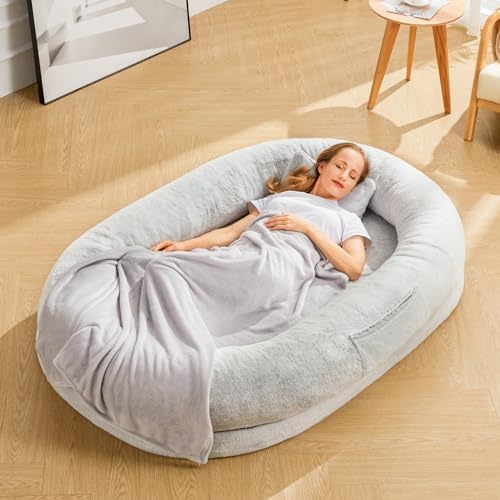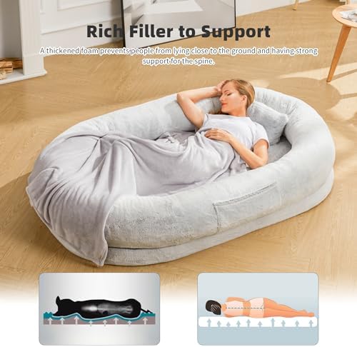 Moms Embracing-like sense of security: Our giant dog bed for humans is made of luxurious short plush fabric, which gives a nice soft skin-friendly feel and is breathable enough to stay comfortable under prolonged use. It can provide a new way to enjoy better rest, doze off, and napping. A pillow and blanket are included.