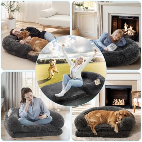 Spacious & Rich Fillers: Overall size of the large dog bed is 72″*43″*10″, spacious enough for you and pets to play in it at the same time. The bottom of the adjustable humand dog bed with handles are filled with high-density orthopedic egg crate suppot foam, which distributes weight, ensuring optimal pressure relief and joint support for both you and your furry friend. The cushioned dog bed bolster, filled with chopped foam, provides excellent head and neck support, ensuring peaceful sleep. offering a sanctuary for comfortable snuggling.