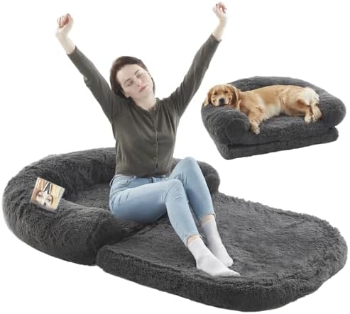 Multiple Uses: Our faux fur plush human dog bed is suitable for medium and large dogs. This surpportive foam large dog bed can also be folded up and used as a sofa, saving space and giving you a variety of furniture experiences. The big barker dog bed is a cozy place to lounge and is perfect for cuddling, napping, reading, or gaming in any room. And it is effortlessly portable with handles at home or for outdoor adventures like picnics and camping. Additional, a handy side pocket is included for storing essentials.