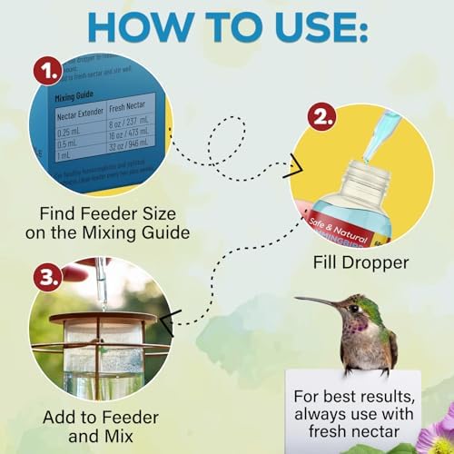 QUICK & EASY MIXING – Perfect measurements for any size hummingbird feeder (8oz to 32oz) with no guesswork. The measured dropper and clear mixing guide make creating nature’s hummingbird attractor simple – fresh nectar that lasts for weeks. Just check, drop, and mix for reliable results