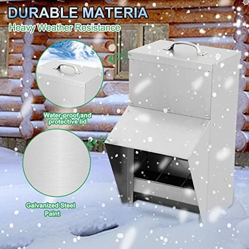 DURABLE MATERIAL: The chicken feeder is made of galvanized steel, which is weatherproof and will be lasting for a long time on the outside no mater how bad weather it is, so no need to worry about this metal chicken feeder will rust and crumble after extended outdoor use.