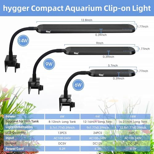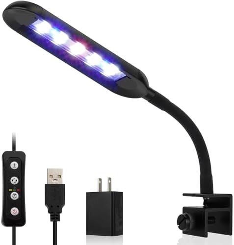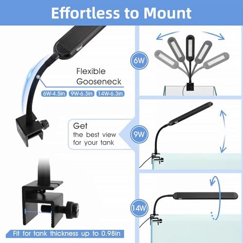 Flexible Gooseneck & Simple Clip: This fish tank clip lamp has a 4.5-inch length of 360° flexible gooseneck tube you can easily adjust the light angle and direction. Upgrade a metal clip bracket with a screw for tightening, which securely for framed or frameless aquarium thickness up to 0.98 inches.