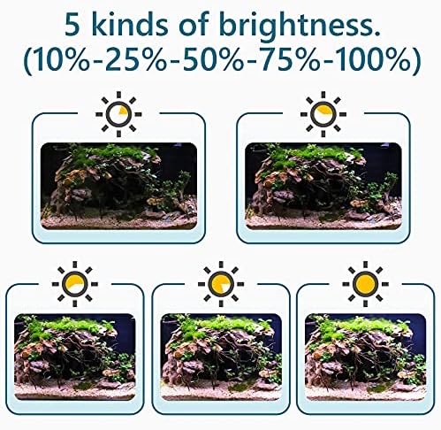 DIY MODE: Full spectrum aquarium light also can change the time + brightness + color. Setting time(TIMER key): 3 kinds of time, 6h, or 10h, or 12h; Brightness(up/down key): 5 kinds of brightness. Color(ON-OFF/ M key): White, Red, Blue, Green, Purple, Orange, Cyan, Cycle Color (no brightness selection)
