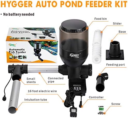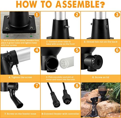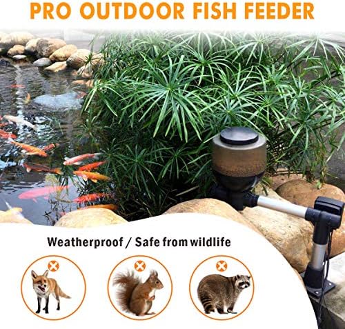 [Designed for Koi Pond] This auto feeder require tools (drill and screwer) to be mounted at the pond’s edge (wooden or stone floor). Constructed with metal and ABS plastic, resistant to bad weather, snap lid is easy to refill and safe from wildlife