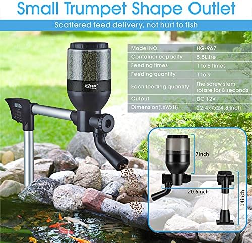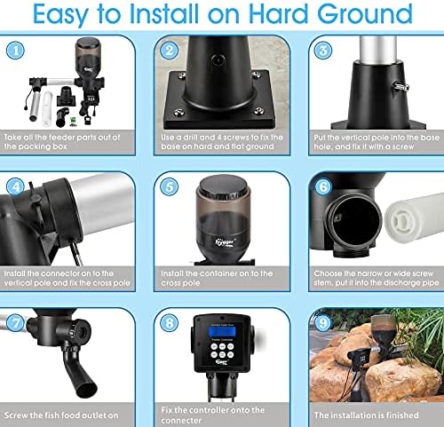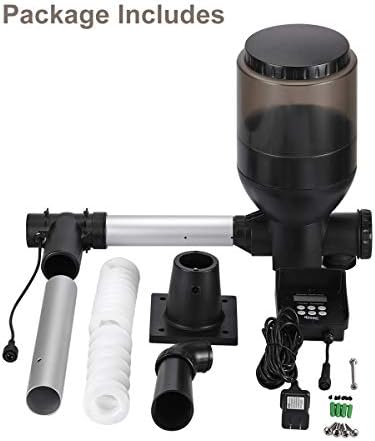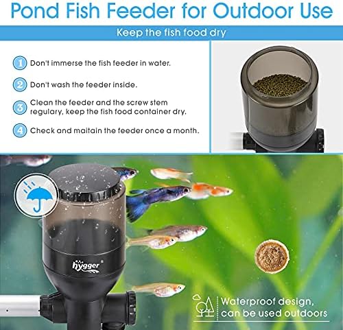 WATERPROOF DESIGN – the whole feeder include the food container, controller has waterproof design, the controller has a half guard to prevent sun shine and rain, the container with a thick lid is made of durable plastic, it will keep the fish food dry even in a raining days. So you can install the fish feeder by the side of pond outdoors. Please don’t submerge the feeder in water and don’t wash the container with water
